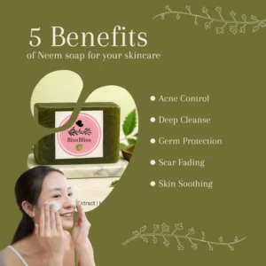 Neem, known for its strong antibacterial and antifungal properties, helps reduce breakouts, soothe skin irritation, and protect against infections. Unlike chemical soaps that strip away natural moisture, BiosBliss Neem Soap keeps your skin hydrated, soft, and fresh all day.
